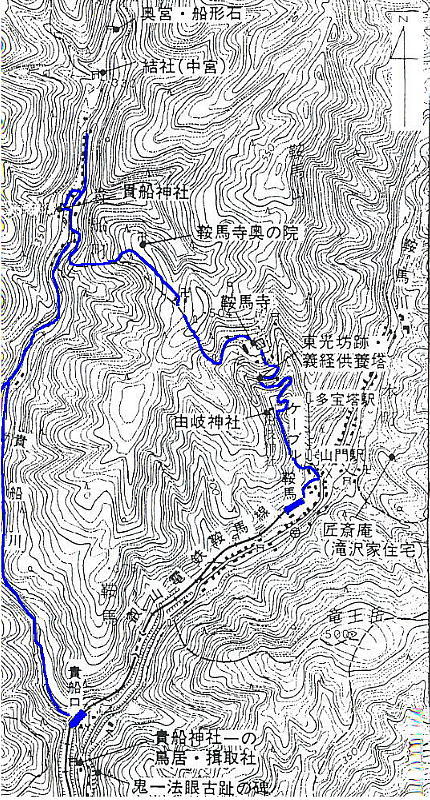 鞍馬寺西門 ↓(徒歩15分)貴船社奥の宮 ↓(徒歩12分)貴船神社 ↓(徒歩30分)