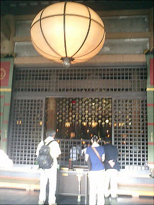 門をくぐり愛山費として200円を払う。まず目に飛び込んできたのが比較的新しい朱塗りの社。立て札
