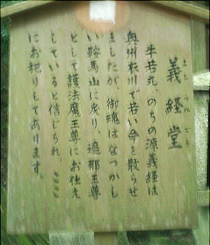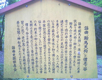 夜になると、牛若は密かに寺を抜けて山奥の僧正ヶ谷に出向き、貴船神社に「源氏を守らせ給へ。宿願ま
