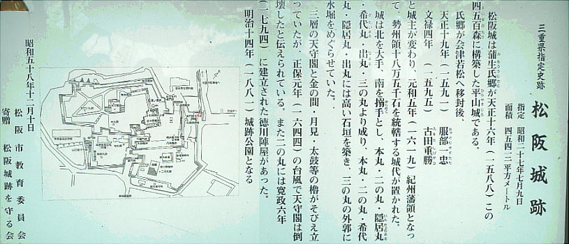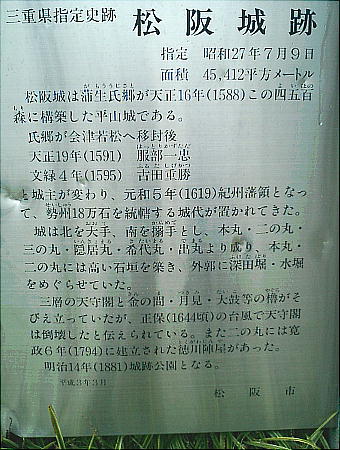 松坂城を築いた蒲生氏郷は3年後に会津へ42万石で移封された。江戸時代に入り松阪は紀州徳川家の領地となり、松坂城には紀州藩
