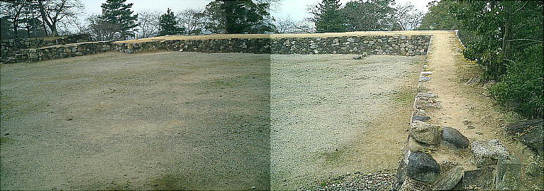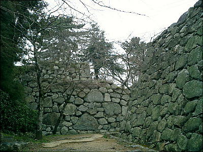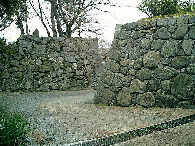 段に分かれた本丸跡の高石垣は三重に重なり、複雑に屈折して死角のない防衛線を築いていたことがよくわかる。城跡への登城道は表門