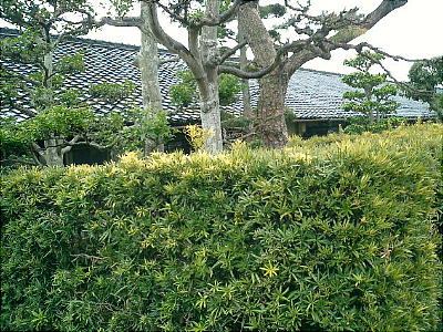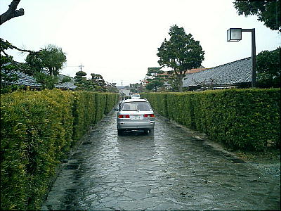 御城番屋敷の家並み。石畳に緑鮮やかな生け垣が見事だ。