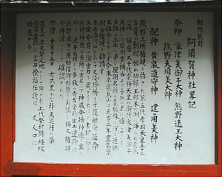 熊野速玉大社に縁の深い神社で祭神は、事解男命、速玉男命を祀っている。中世に大火にあって古文書を焼失したため、詳
