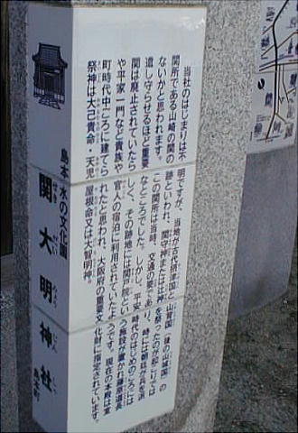 当地が古代摂津の国と山背(やましろ)の国との関所である「山崎の関」跡と言われ、関守の神、または辻の神を祀ったのが当神社