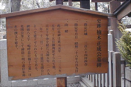 元水戸藩主・徳川光圀は、ここを訪れた時正成の墓が荒廃しているのを嘆き、「嗚呼忠臣楠子の墓」と自書した墓碑
