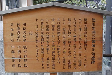 を建立して、全国に大楠公の盛徳を顕彰した。正成の墓の側にある水戸・徳川光圀の銅像は、資料にもとづき、彫刻