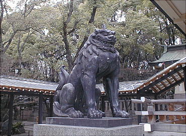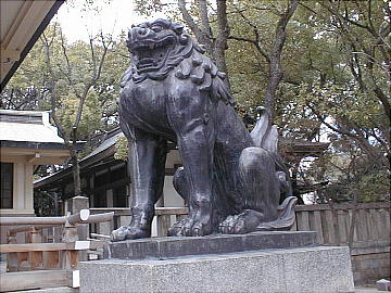 「建水分神社」(たてみくまりじんじゃ)の南木社でも狛犬の頭に角があったが、楠公と角のある狛犬はなにか