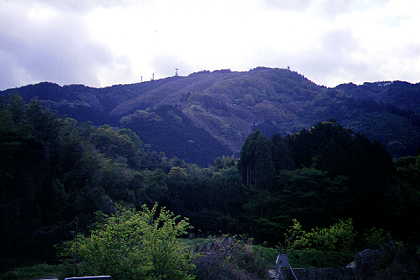 山麓の大原野神社付近(京都市右京区大原野南春日町)から見た小塩山。アンテナの立ち並ぶ山頂に、宮内庁が比定した(作った?)
