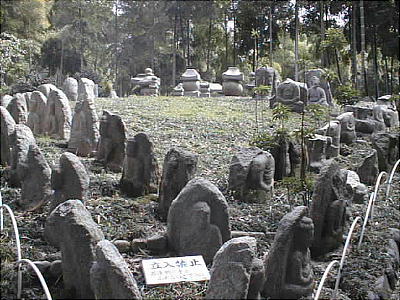 登る坂道の石段には、足で踏みつける側に野仏の顔があった。大阪城の石垣にも石仏がたくさん使われている。我々はこう
