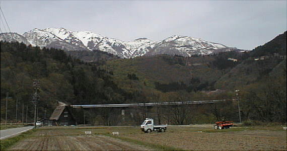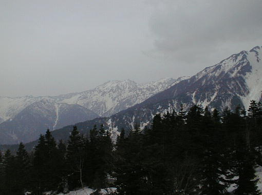 夏の緑を期待して来たが、山々はまだ深々と雪を戴いている。山里も、新緑どころか立ち枯れの林が残っている所もあった。