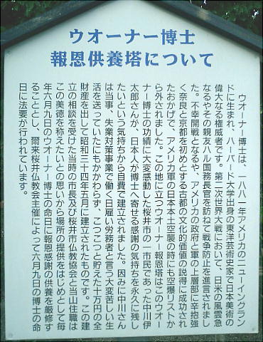 ウォーナー博士記念塔というのがあった。博士は、第二次世界大戦時アメリカ政府と軍の上層部に、奈良と京都