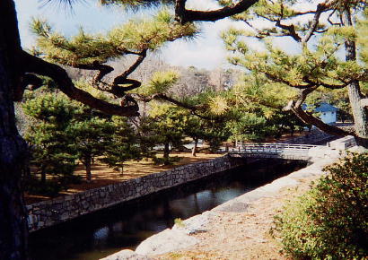二の丸庭園は、古来からの造庭術にしたがい、池の中央に蓬莱島、その左右に鶴亀の島を配した池泉回遊式で、小堀遠州の作と伝えら
