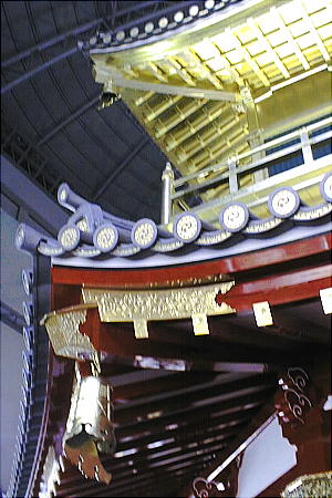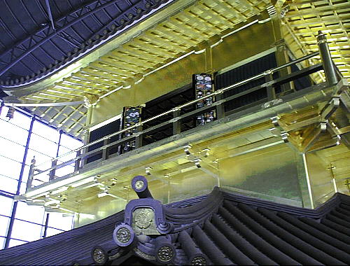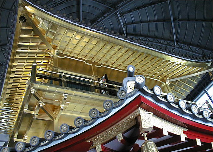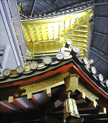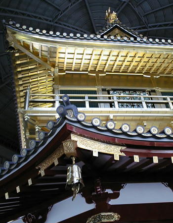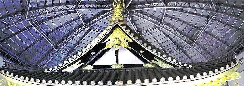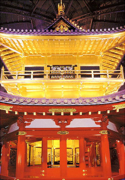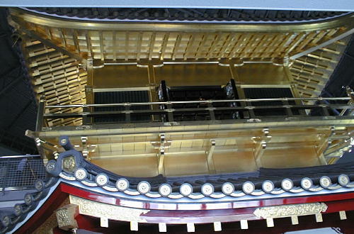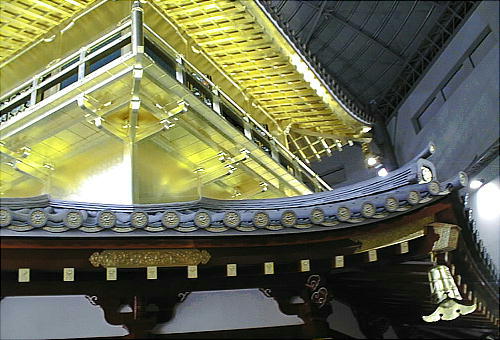 現した「庇屋根」、天人の飛ぶさまを描いた天井「天人影向図」(てんにんようこうず)、6階部分に金箔10万枚を使用した「外壁」、