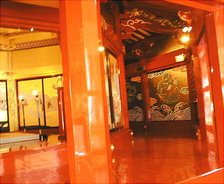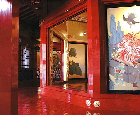 上は鬼瓦を正面から見たところ。鯱の腹の部分が見えている。 黒漆塗の床(下)に、戸や障壁画が映る。