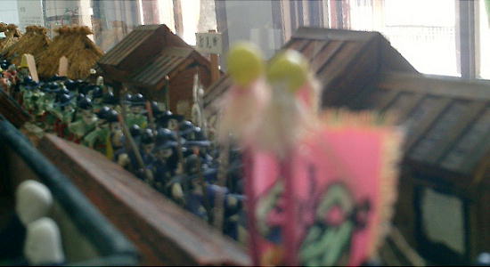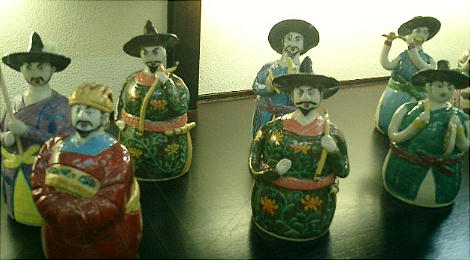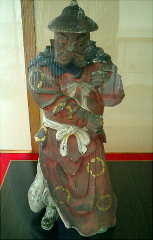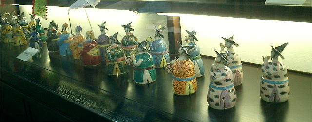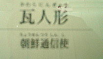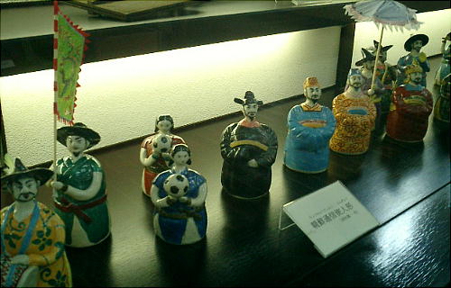 ガラス張りの陳列棚に収まる朝鮮通信使の瓦人形。寺社仏閣入り口の仁王を思わせる。