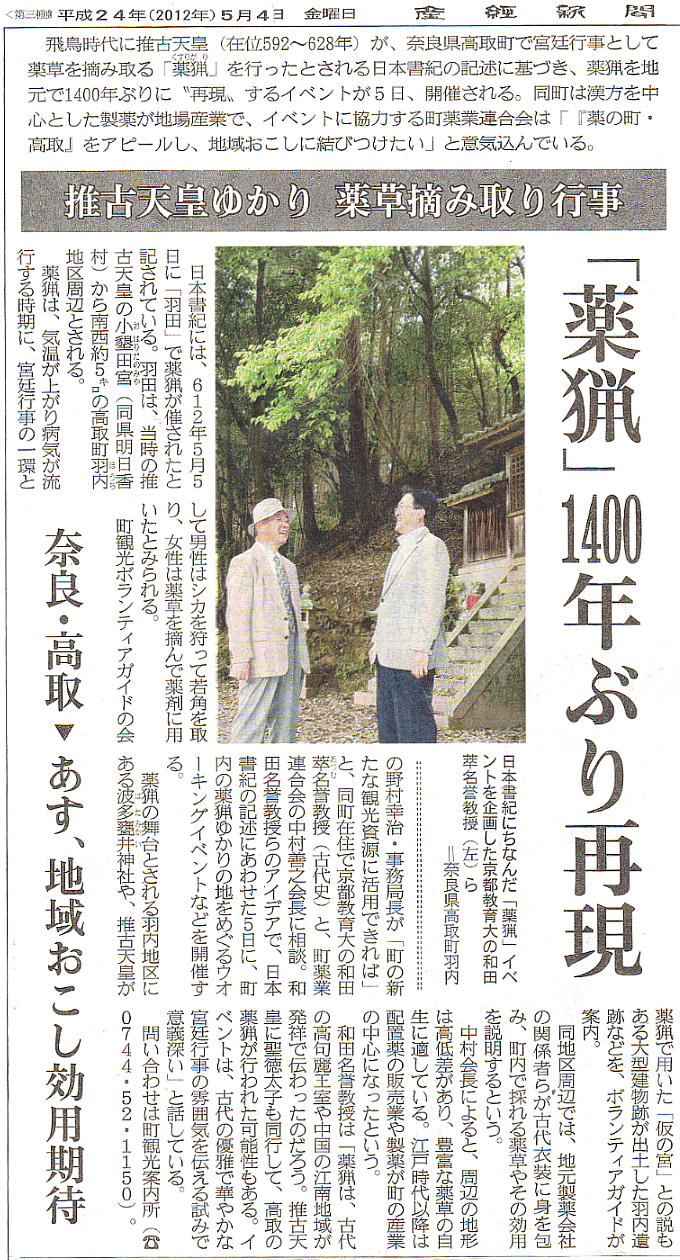 推古19年(611)薬狩りをした記述が日本書紀にあり、男は鹿を狩って角をとり、女は薬草をつむ日本で最初の薬猟の里であったという。
