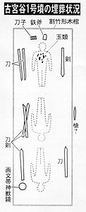 菟田野町古市場、古墳時代前期−中期(四世紀末−五世紀初め)の古宮谷1号墳から、<三種の神器>の鏡、剣、玉がそろった豊富な副