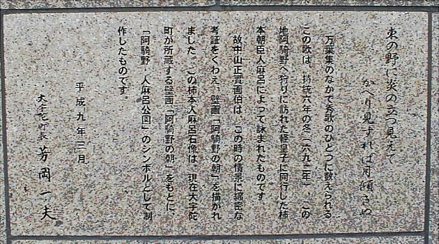 れた柿本人麻呂が「ひむがしの野にかぎろひの立つみえてかえりみすれば月かたぶきぬ」と名歌を残したゆかりの地である。