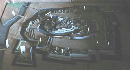 の大門(おおもん)、上部を渡櫓(わたりやぐら)、南に折れ曲がった部分を続櫓(つづきやぐら)という。会わせた面積は600u、