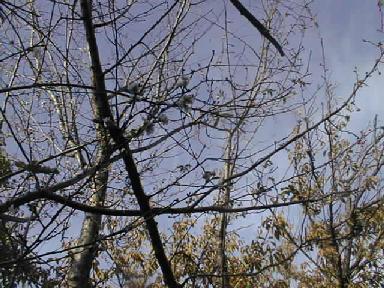 上下の木をよく見ると小さな花が咲いている。桜である。大阪城内には冬咲く桜が3本あって、歩行路からは一寸はずれているため