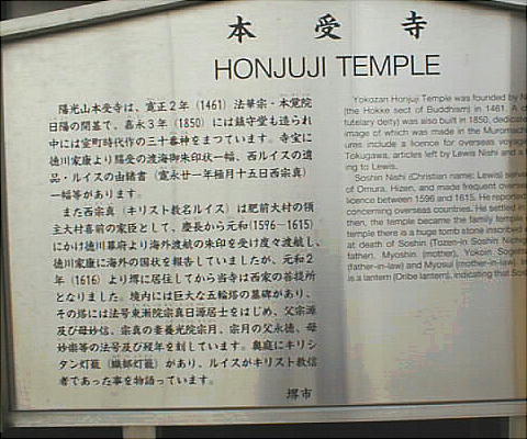 西ルイス宅跡の東隣りに日蓮宗本受寺がある。墓は五輪塔で、「東漸院宗真日源居士、正保三年(1646)丙戌正月五日」と刻まれている。