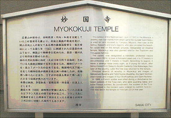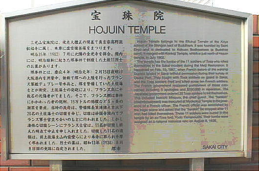 というような、一般的な上記の寺の縁起より、この寺は「堺事件」の侍たちの割腹の場所としての方が有名である。上右の石碑にも、