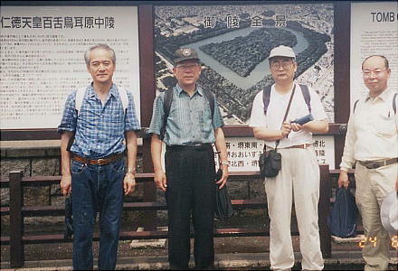 履中陵古墳の前で。この日は朝から雨で参加者も少なくどうなる事かと思っていたが、雨は午前中で止み、午後からは汗ばむような陽気になった。