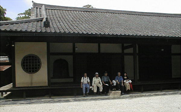 本堂の縁側に腰掛けて、方丈枯山水の庭園を眺めるメンバー。(下)