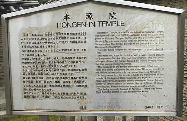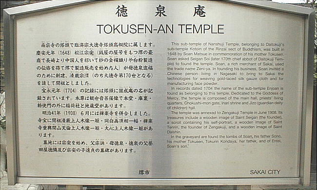 沢庵和尚と堺奉行喜多見若狭守勝重により再建された。茶人・千利休が若いころ禅の修業をした寺で、境内には