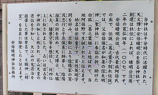 安倍晴明神社は、阿倍野元町5ー16、旧熊野街道に面している。祭神はその名の通り、天文学者にして陰陽師としても