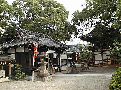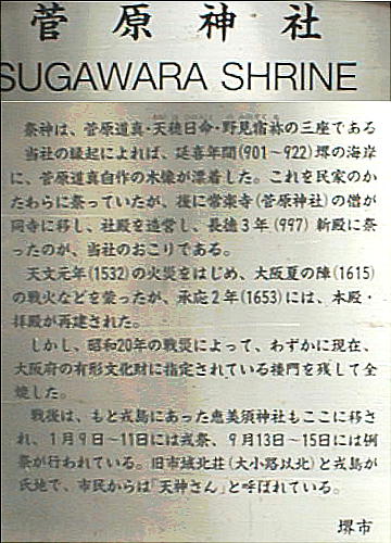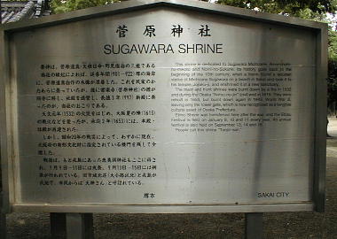 堺奉行所跡のすぐ南にある。祭神は菅原道真・天穂日命(あめのほひのみこと)・野見宿禰(のみのすくね)である。 創建は定かでない。「堺鑑」という書物によれば、道真が太宰府で彫った「七天神」の一つが延喜年間(900年初頭) に、ここ堺の浜に流れ着き、拾った町民が民家に祀っていたが、その神体が空を飛んだので社殿を造営した、と なっている。