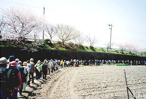 下右は、狭山池および博物館を目指して歩く今日の参加者達。70名ほどいただろうか。私は殆どビリの方にいる。