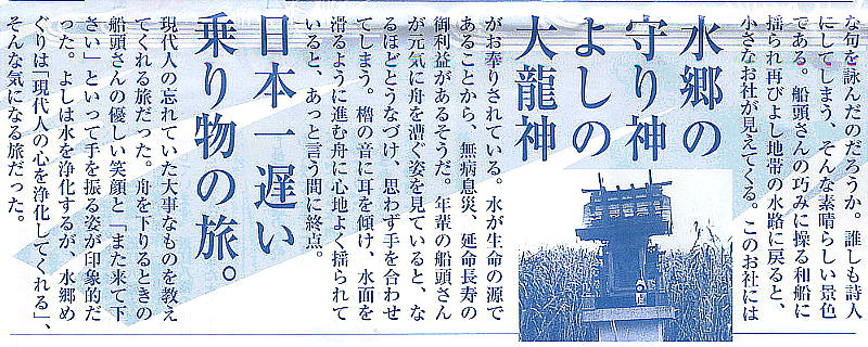 私ははこれまでに、福岡の柳川堀めぐりや、島根松江城下の水郷めぐりなどを体験したことがあるが、ここ