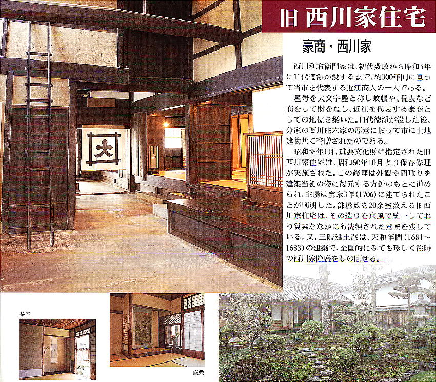 江戸時代の大商人・西川利右衛門の旧宅は、国の重要文化財に指定された商家である。利右衛門は屋号を大