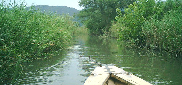 た水路を行く1,2時間の旅は、これこそ「舟遊び」である。シラサギ、アオサギが宙に舞い、カイツブリ