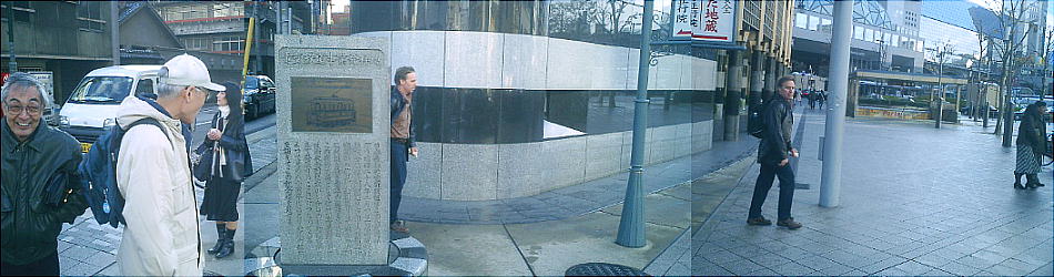 京都駅前に立つ「電気鉄道事業発祥の地」碑。上右の角が京都駅。