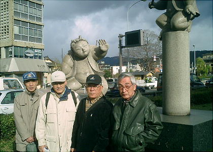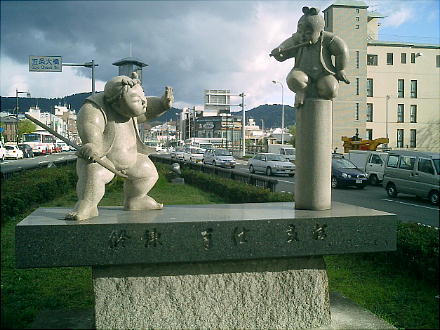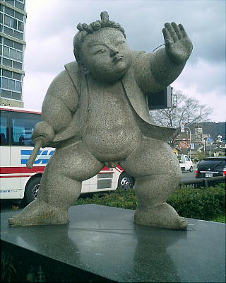 五條大橋へ至る通りのど真ん中の緑地帯に、牛若丸と弁慶の、「五条大橋の戦い」の人形が立っている。刀千本を集め