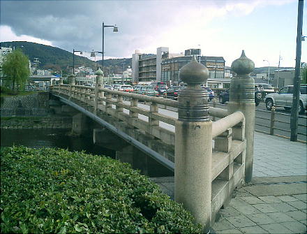 時には今よりもっと高いところに掛けられ、階段や坂を上って渡る様になっていた。明治28年、沿岸の二条と五条の間を日本最初の