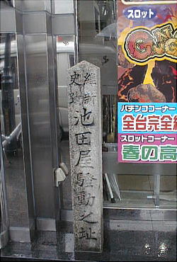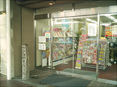 旅館近江屋跡。今は四条通と三条通りの間で、河原町通りに面した「京阪交通社」の軒先にある。