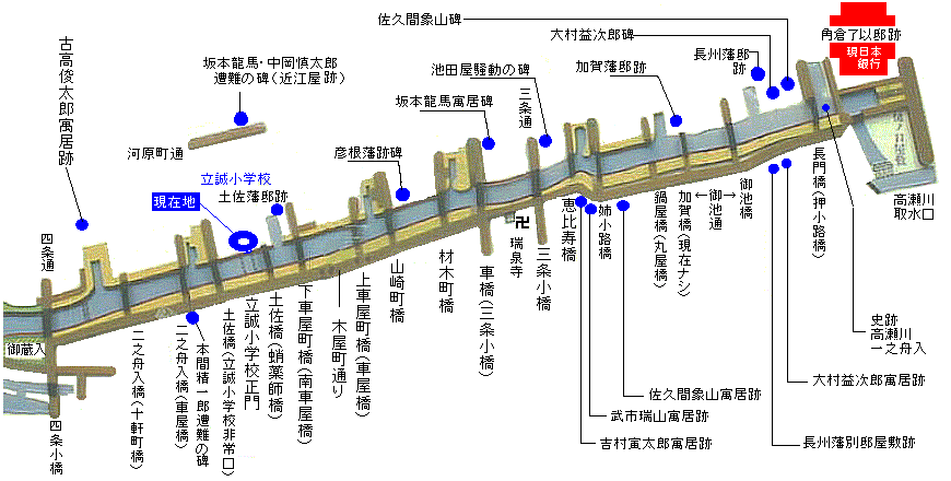 高瀬川は木屋町通の西を流れるが、木屋町の名はここに材木業者が多かったことに由来するという。幕末の頃は勤皇浪