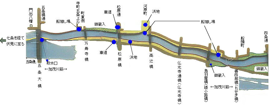 ったが今は川幅は半分程度になっている。また、鴨川から伏見へ至る東の高瀬川は、もう存在しない。