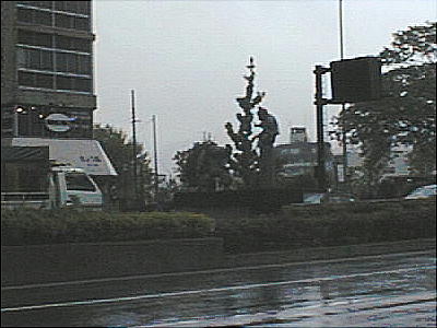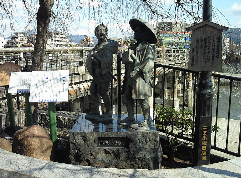 五条通りには牛若丸と弁慶の京人形像がたっているが、写真は雨でうまく見えない。
