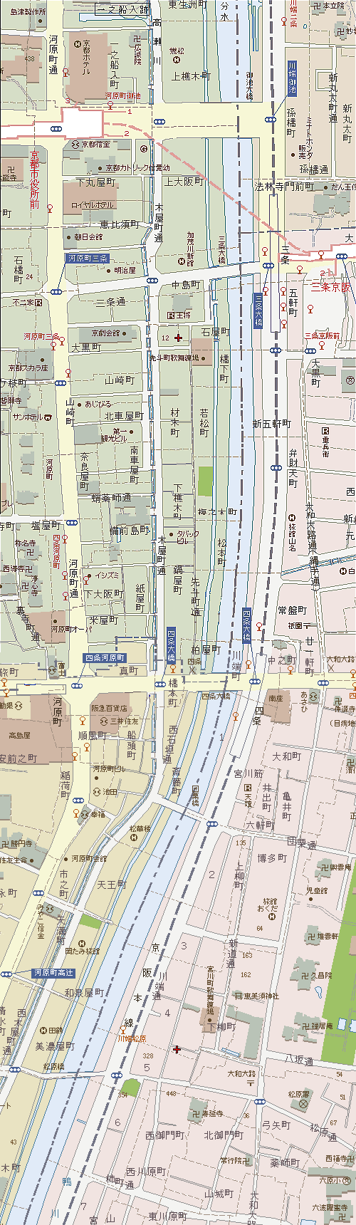 沿岸の二条と五条の間を日本最初のチンチン電車が通る事になり川岸も整備され、現在のような、三条・四条・五条を除く