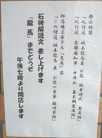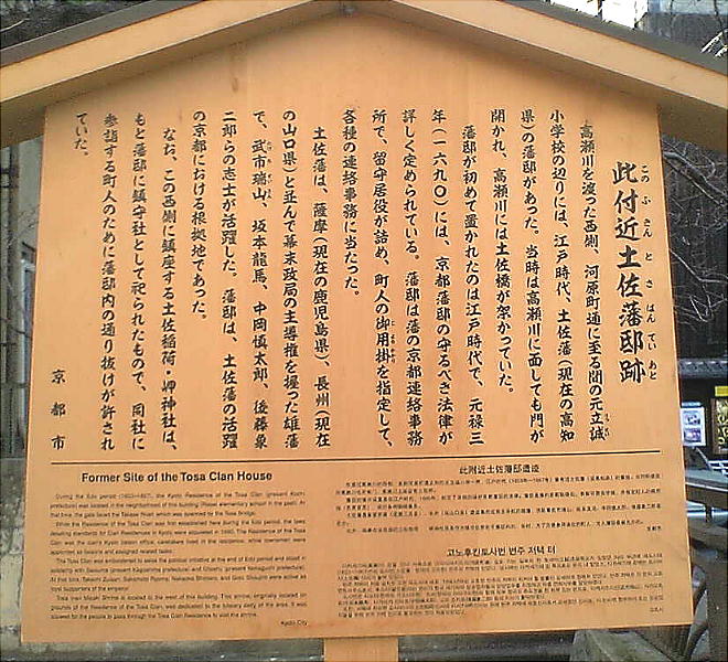 碑一本だけなのに対して、長州藩跡には一応説明書きがある。土佐藩邸は、土佐出身の坂本龍馬が暗殺された近江屋とは目