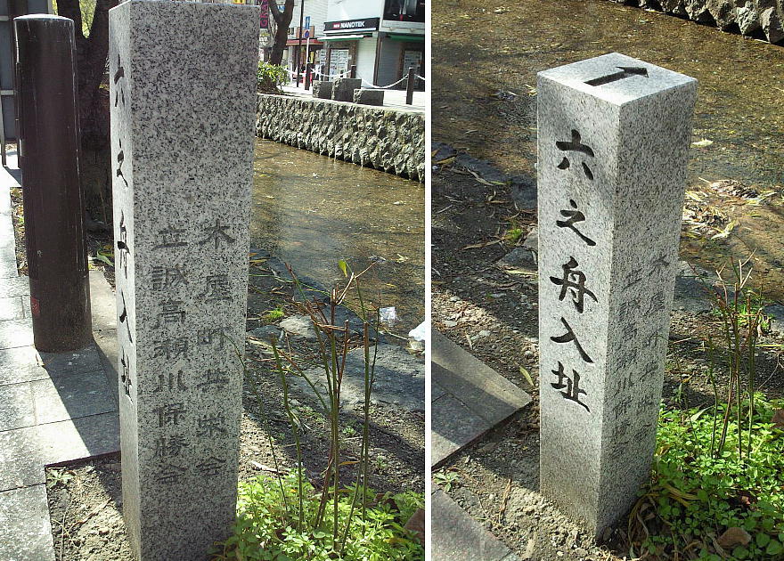 同地域の高瀬川保存会によって高瀬川開創350年を記念して建立された。高瀬船の船板を模したモニュメントの上に角倉