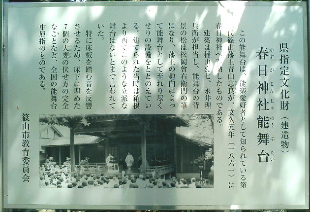 春には「篠山春日能」、秋は「丹波夜能」や狂言が行われる。篠山春日神社は、867年、奈良の春日神社の分霊を今の篠山城跡に