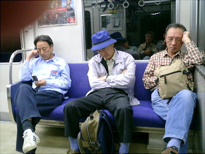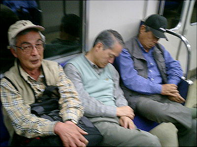 帰りの「福知山線(宝塚線/東西線)」の中で眠りこける酔っぱらいのおじさんたち。↓