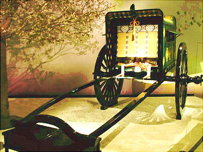 <原寸大の復元牛車>平安時代の貴族たちの乗り物である牛車。実物大で復元されていて、高さ3m、長さ5.8mとある。