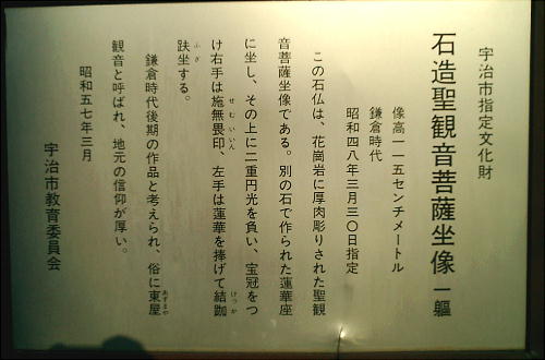 り進んでいるが、観音の表情は穏やかで、鎌倉後期の作と伝えられる。宇治市の重要文化財。側に、三室戸の「莵道稚郎子陵墓」