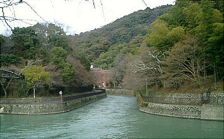 朝霧橋を渡って中之島(塔の島)を出ると宇治川の北岸に出る。すぐ目の前に宇治神社の鳥居が見える。そして橋の左手の匂宮と